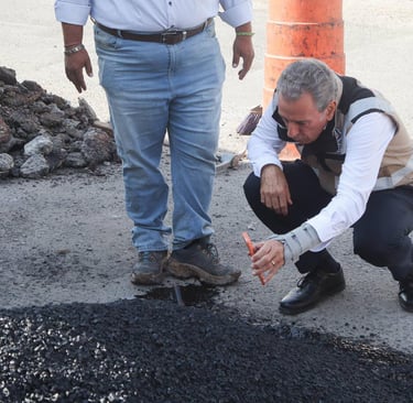 Supervisión de bacheo en la 119 Pte (Agua Santa/Guadalupe Hidalgo) por el Alcalde Pepe Chedraui. Una obra clave para mejorar la movilidad y seguridad vial en el sur de Puebla.